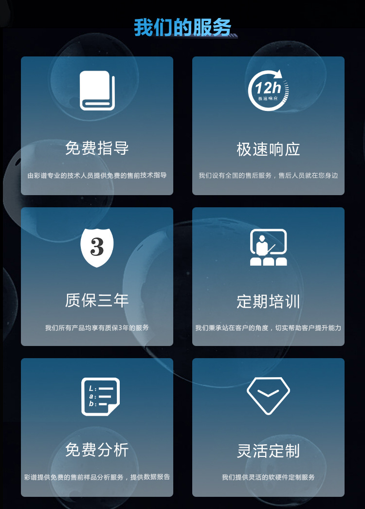 | 附件 | 電源適配器、數據線、透射夾具、軟件U盤、黑腔、白板、綠板、0%校準遮光蓋(820N附帶)、30mm口徑板、 18 mm口徑板、11 mm口徑板、6 mm口徑板、支撐臺、比色皿、阻尼把手 |