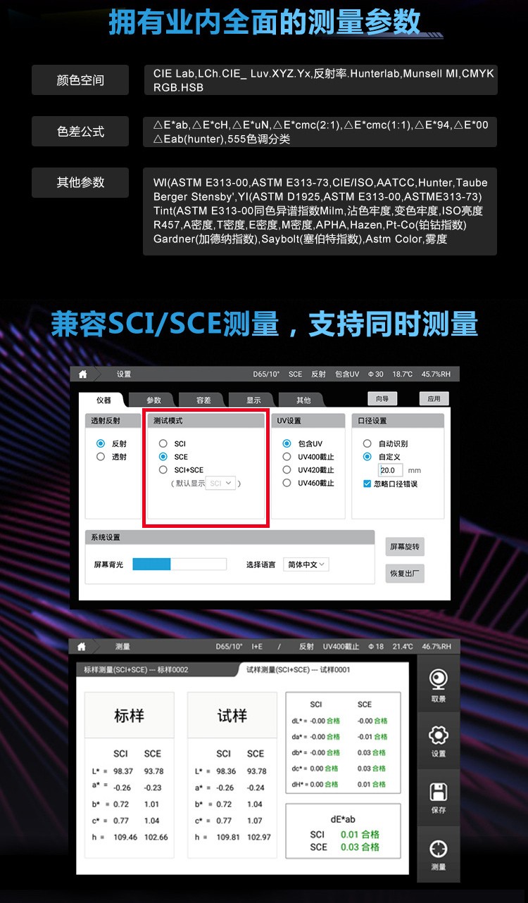 | 色差公式 | ΔE*ab,ΔE*CH,ΔE*uv,ΔE*cmc,ΔE*94,ΔE*00,ΔEab(Hunter),555色調分類 |