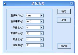 通訊端口可根據(jù)串口線所連接的計算機串口設(shè)置串口號。點擊確定按鈕,存儲新的設(shè)定值并退出本窗體。其它通訊設(shè)置在儀器出廠前已設(shè)置好,請勿隨意改動!點擊默認(rèn)值按鈕可恢復(fù)初始設(shè)置。點擊取消按鈕,將不對設(shè)置進行修改并退出本窗體。