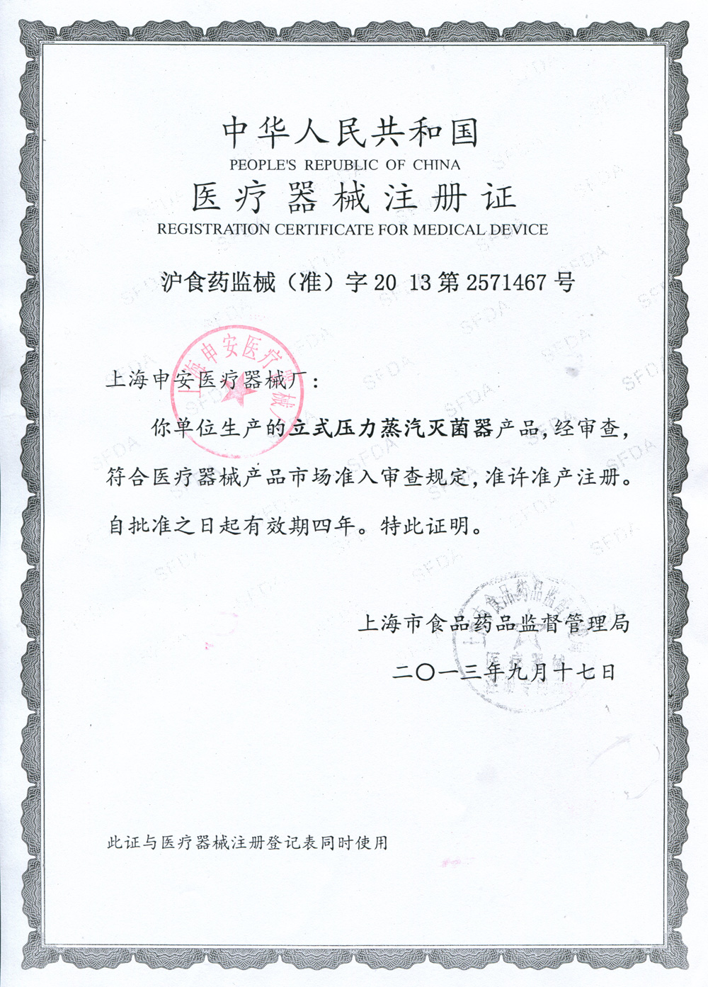 滬食藥監(jiān)械(準(zhǔn))字2013第2571467號(hào)